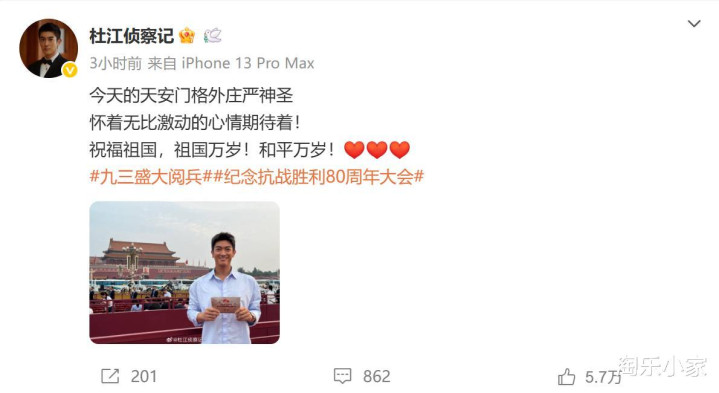 他在社交平台上激动地写道:“今天的天安门格外庄严神圣,怀着无比激动的心情期待着!祝福祖国,祖国万岁!和平万岁!”