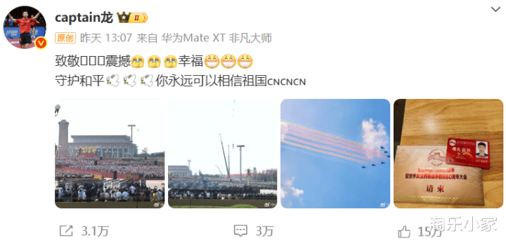 马龙在阅兵仪式结束后,立即在社交媒体激动地写道:“致敬!震撼!幸福!”并深情表白:“守护和平,你永远可以相信祖国”。