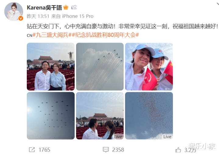 观礼结束后,吴千语在社交平台上激动地写道:“站在天安门下,心中充满自豪与激动!非常荣幸见证这一刻,祝福祖国越来越好!”