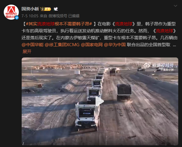 更扎心的是官方号。国资委7月直接甩图:内蒙古露天矿,无人重卡一趟拉300吨,“韩子昂看了都沉默”。央视军事也凑热闹,剪了个对比视频,标题一句“看完新装备,瞬间觉得《流浪地球2》像纪录片”,弹幕齐刷“官方吐槽,最为致命”。
