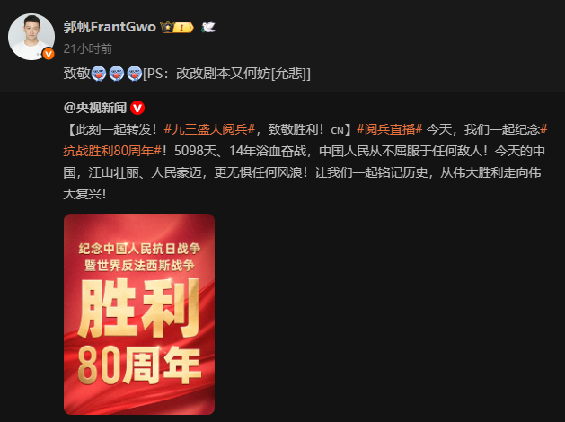 9月3号,抗战胜利80周年,天安门广场秒变“硬核秀场”。歼击机拉彩烟、导弹车碾着心跳过线,网友边数飞机边喊解压。就在弹幕飞得最猛的时候,《流浪地球》导演郭帆偷偷发了条动态:看完只想说——“改改剧本又何妨【允悲】”