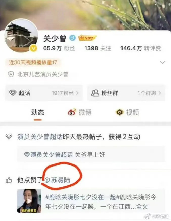 据@羊城晚报报道,近日,有网友发现,女星关晓彤的父亲@关少曾点赞娱乐博主@苏易陆发布的文章,内容直指“鹿晗关晓彤今年七夕来同框”,并关联分手传闻,随后关爸取消点赞。