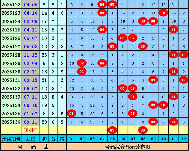 后区分析:上期后区开出0路+2路号09和11,最近30期后区奖号012路比为18:20:22,最近10期后区奖号012路比为6:6:8,本期后区注意号码03、05、08、10、11,单挑两码组合05、08。