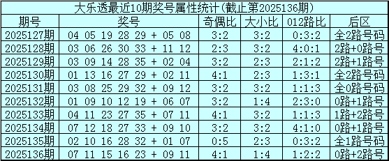 大乐透第2025136期开奖号码:07 11 15 16 23 + 09 11。前区奖号大小比为1:4,奇偶比为4:1,012路比为1:2:2,后区为0路+2路号。