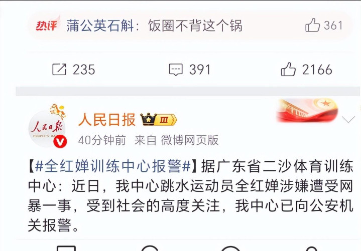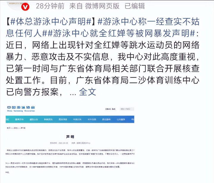 2026 年 4 月 8 日,全红婵所属的广东省二沙体育训练中心率先发布声明,明确表示已就此事正式向公安机关报案,坚决追究网暴者的法律责任。