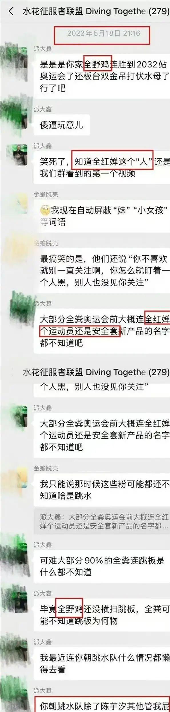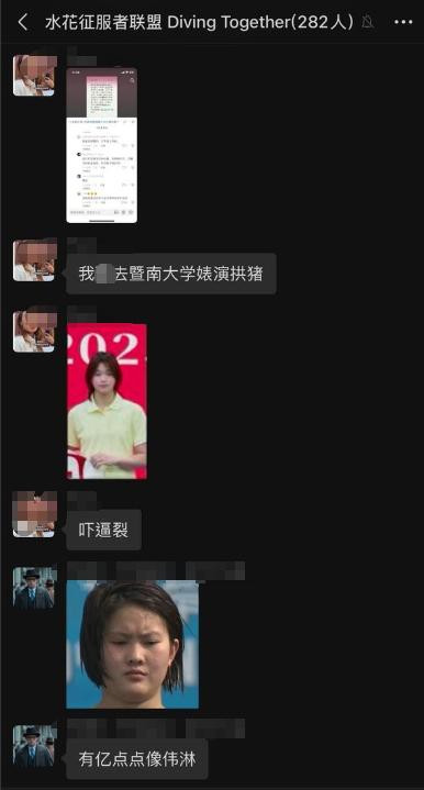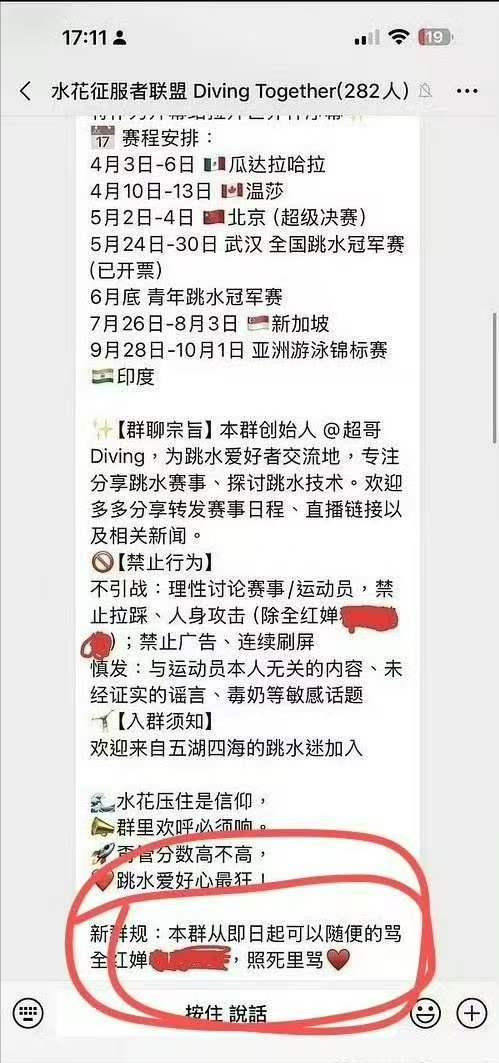 这个叫 “水花征服者联盟” 的微信群,足足 282 人,群公告白纸黑字写着 “禁止攻击其他运动员,全红婵除外,可以随意骂,照死里骂”。