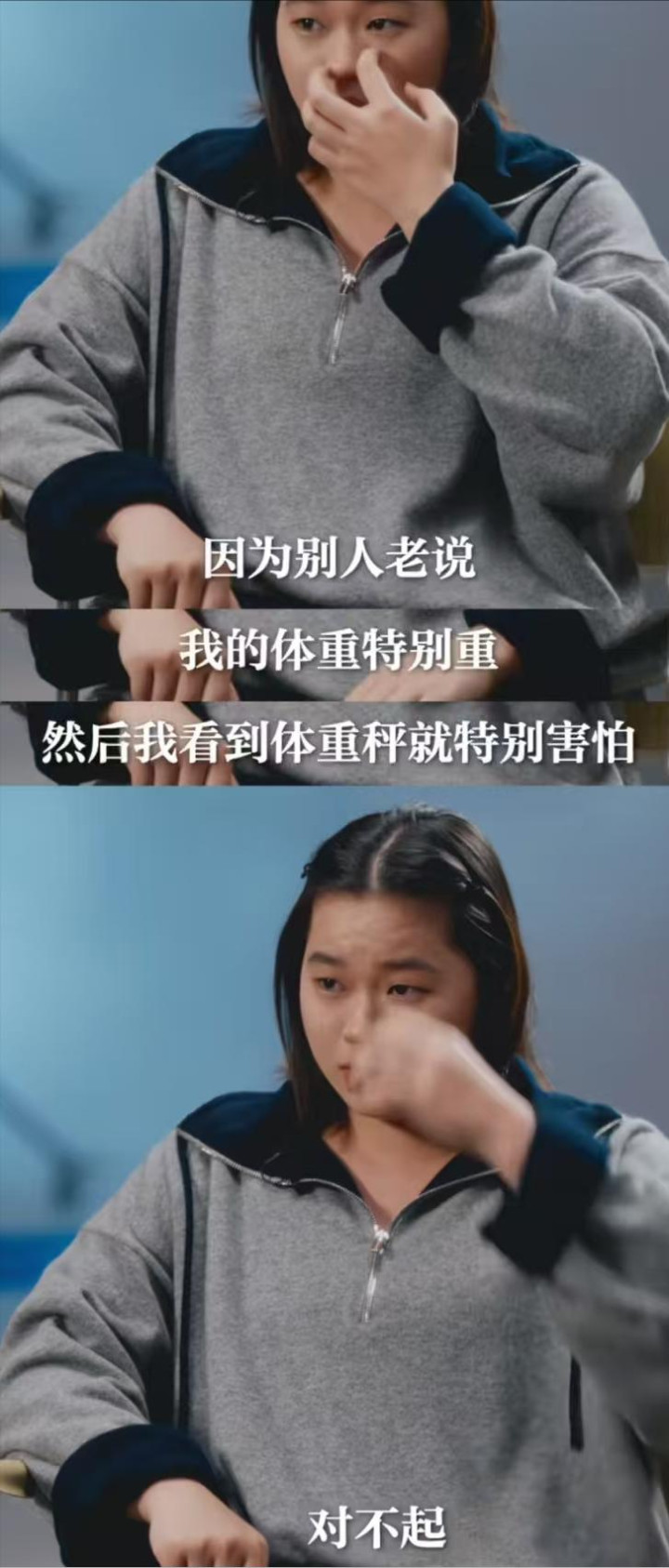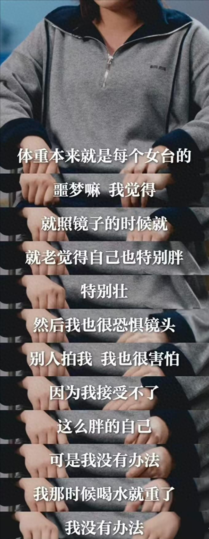 “别骂我,别骂我家人和朋友”。她说自己看到体重秤就害怕,明明每天只吃一顿饭,体重却居高不下,连穿裙子、照镜子都成了奢望。