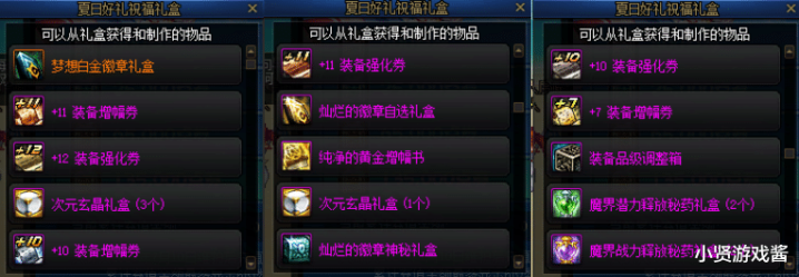 礼包中的夏日好礼祝福礼盒可在26种道具中随机获得一种,给力的道具有梦想白金徽章礼盒、+11增幅券、+12增幅券,不过概率大家都懂得,基本是复活币+雷米。