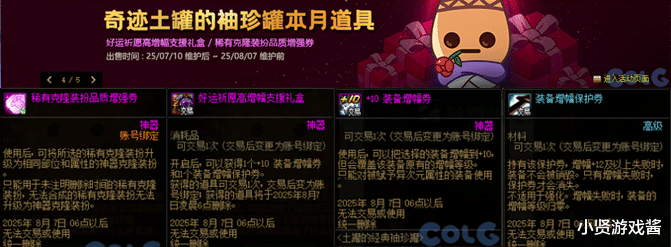 土罐加入的道具分别是龙透升级券,以及好运祈愿增幅支援礼盒!前者可以把稀有透明升级为神器透明,无法交易。后者已经连续加入3次,对增幅有需求的玩家建议7.10再买。