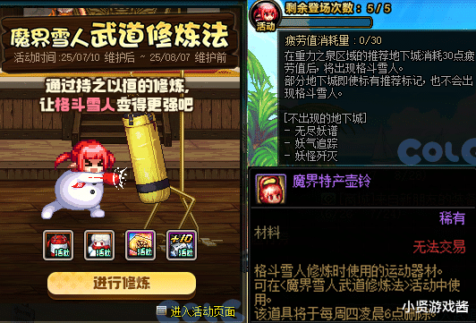 最后,魔界人雪人武道修炼场是刷图活动!在活动期间刷推荐地下城,并消耗30点疲劳值,地下城内就会出现格斗雪人,击败后可获得“壶铃”。