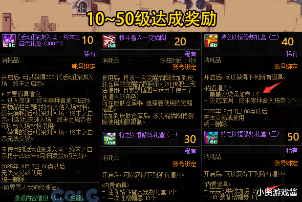 其中10级有300张深渊票、20级有一个格斗雪人一觉插画,30级有一个格斗雪人宠物+10个增幅器,40级有一个“盖盖沙袋”+1个大深渊票,50级有一个肥宗沙袋和+10增幅券。