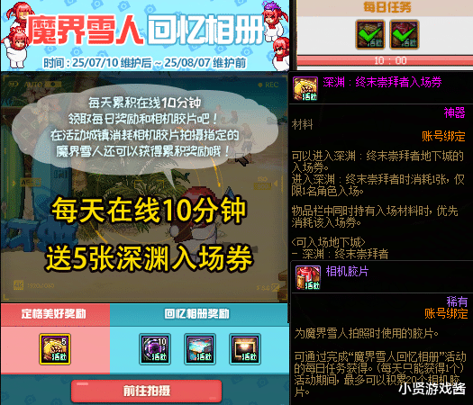 魔界雪人回忆相册是站街活动!每天上线10积分即可获得领取1个相机胶片,以及5张深渊入场券,活动持续28天,总共可获得28个相机碎片+140个深渊入场券。