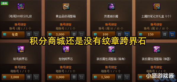 积分商城方面比较鸡肋,核心道具是黄金品级调整箱、称号跨界石,以及宠物跨界石!并没有纹章跨界石。51版本的积分商城没加入,夏日礼包也没人加入是让人挺意外的,旧纹章想跨界想跨给小号都没机会,不得不说“白狐狸”是真的抠门。