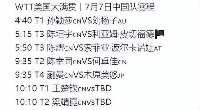 目前可以确定时间和对手的是孙颖莎等名将,从赛程看,孙颖莎是国乒第一位出战的选手,将在7月7日凌晨4点40分,迎战澳大利亚选手刘杨子,双方实力差距明显。