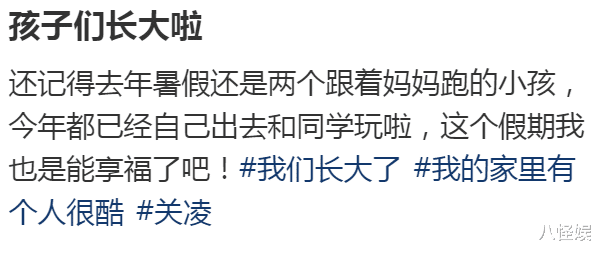 7月6日,初代国民闺女关凌在个人社交平台分享出与一双儿女合照,对于已经放暑假的两个孩子,关凌附文感慨称孩子们长大啦,去年暑假俩孩子还是跟着妈妈跑的小孩,但今年都已经自己出去和同学玩啦。