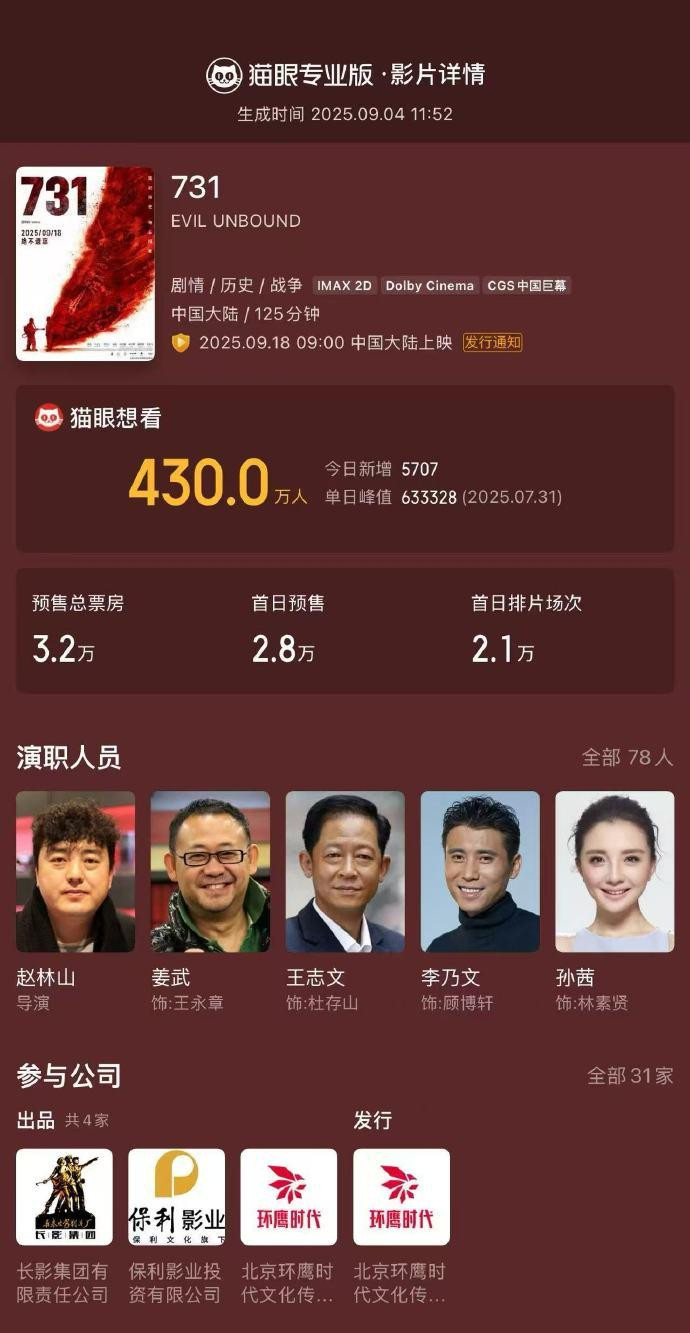 由赵林山执导,姜武、王志文、李乃文领衔主演,孙茜、冯文娟等主演的《731》未映先火。主要讲述了抗战胜利前夕,侵华日军为了扭转战局在哈尔滨平房区开展细菌战研究,屠戮百姓进行人体实验的故事。