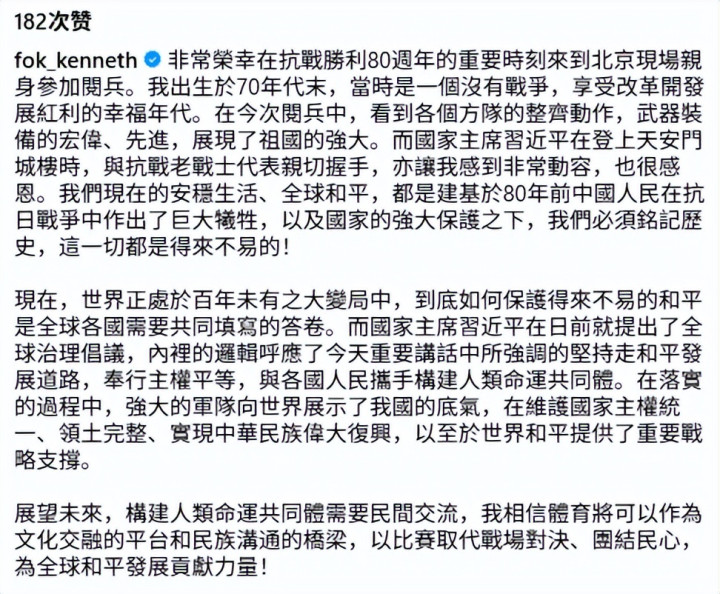 他在文中表示,自己没有经历战争,享受改革开放的红利,在这次阅兵中,看到了祖国的强大,我们的安稳生活和全球和平,都是基于80年前中华人民在抗日战争作出了巨大牺牲,必须铭记历史,这一切都来之不易。