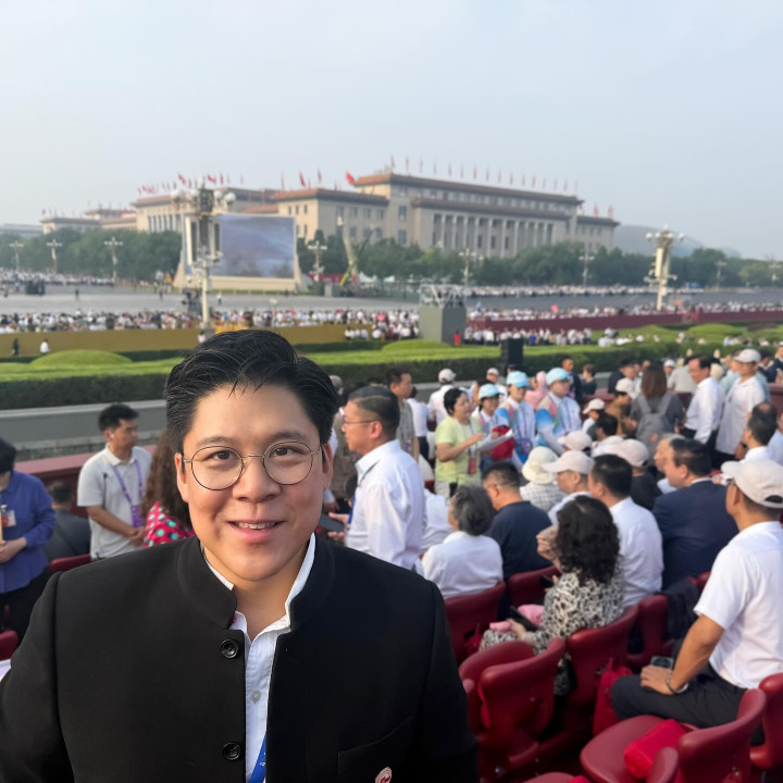 霍启刚在3日下午发文,晒出多张现场照片,他当天穿了黑色中山装,笑容满面自拍,一脸的自豪,接着分享了多段阅兵视频,心情满是激动。