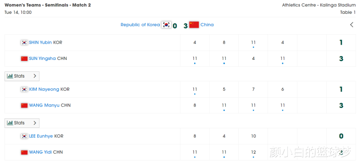 半决赛对阵韩国的比赛,中国队派出的是孙颖莎、王曼昱、王艺迪,最终孙颖莎3-1申裕斌、王曼昱3-1金娜英、王艺迪3-0李恩惠;