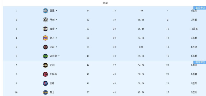 NBA常规赛,倒数第二轮,随和掘金击败雷霆,湖人轻取太阳,火箭爆冷不敌森林狼,开拓者击败快船,西部格局基本已经明朗起来,让我们来看看具体的情况。