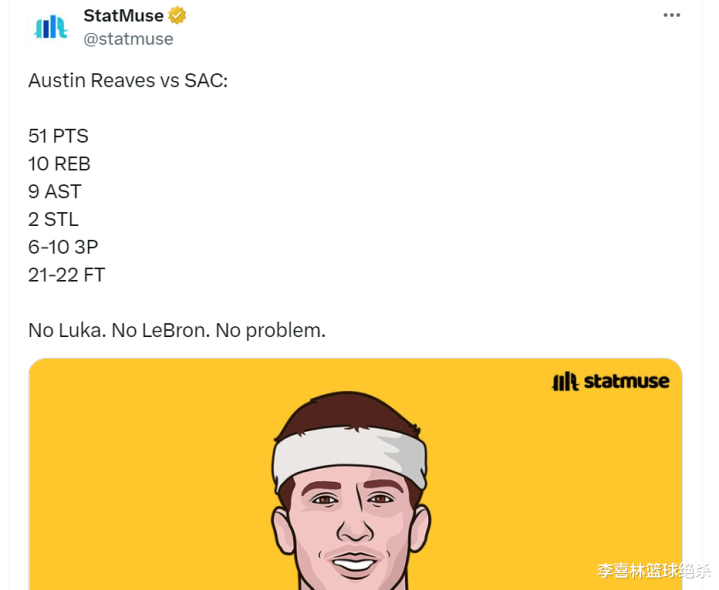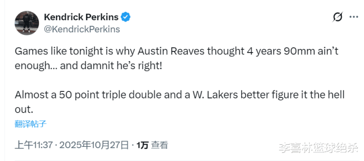 里夫斯这一战也证明了他在今年夏天拒绝湖人给出的4年8920万美元提前续约合同是明智的。名宿帕金斯在推特上写道:“今晚这样的比赛就是里夫斯认为4年9000万(实际为8920万)不够的原因。而且,天呐,他是对的。几乎拿下50分三双,而且拿到一场胜利,湖人最好弄清楚这件事。”